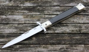 Wie so oft lass ich mich von Kundenwünschen inspieren und habe von meinem grossen Swingguard nun einen Nachbau gemacht, einfach nach Kundenwunsch. War eine echt tolle und auch aufwendige Arbeit, sieht Hammermässig aus. Das Messer ist 330mm lang, Klinge aus RWL34 mit Lasergravur nach Kundenwunsch. Griffschalen schwarzes G10, Heft Neusilber. Und nun lasssen wir Bilder …