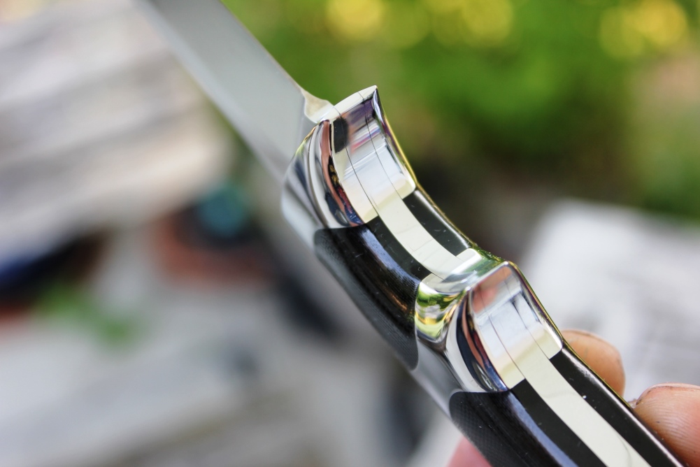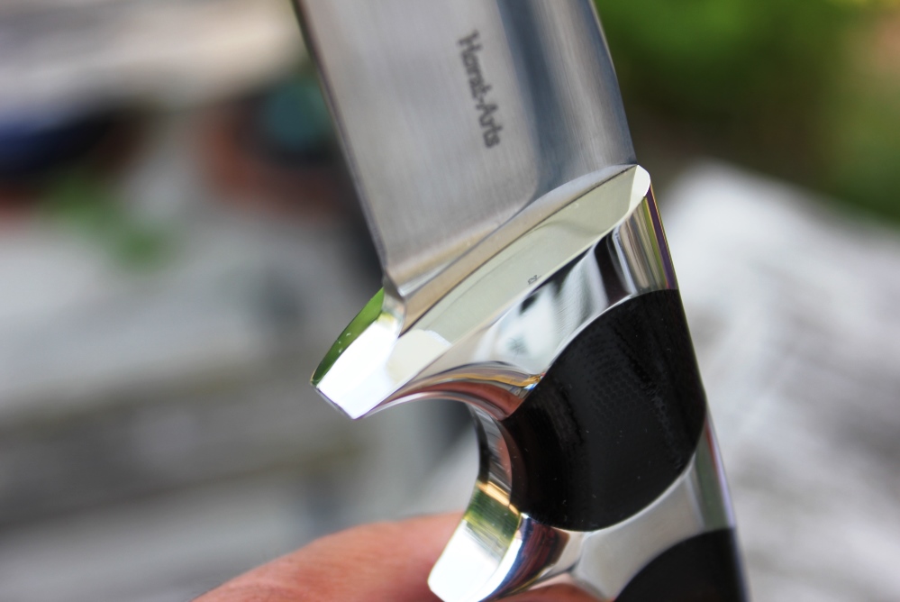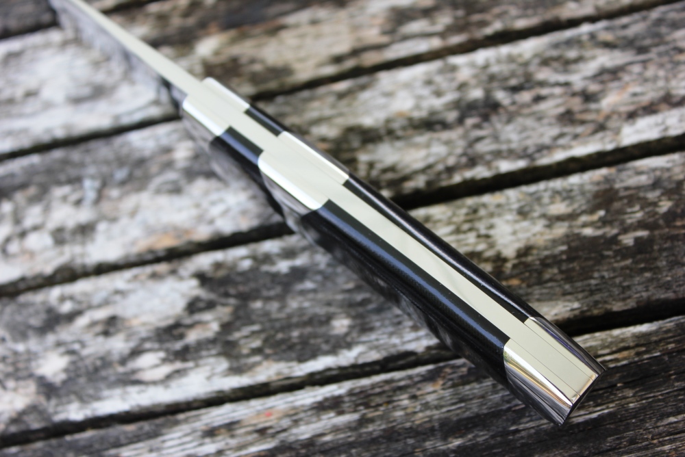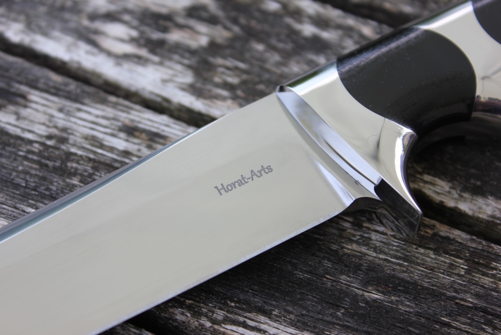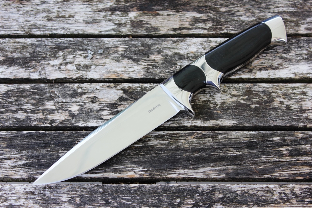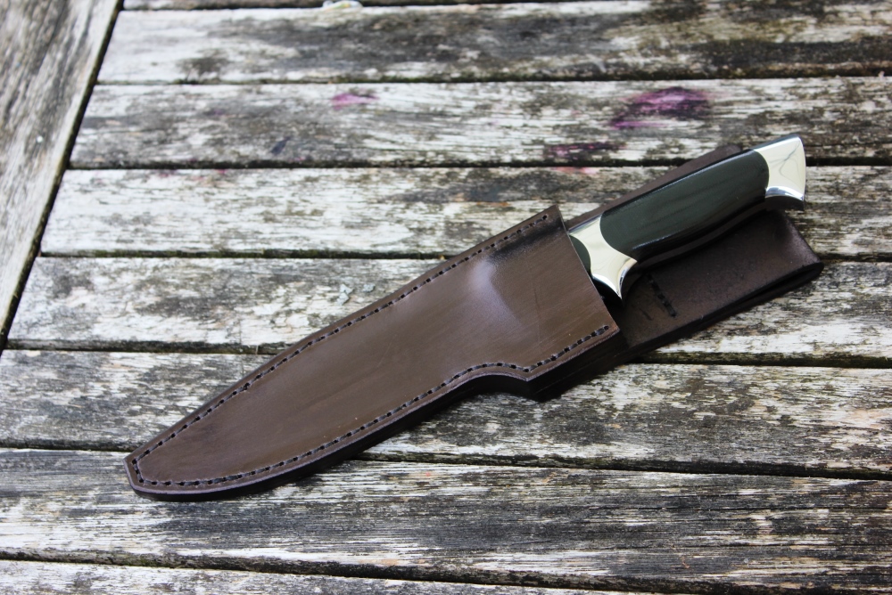 Dieses wunder schöne Messer war ein Kundenauftrag. Aus einem alten Entwurf entstanden aber etwas verkleinert, für eher zierliche Hände ist dieses Subhilt Messer. Subhilt weil es zwischen ersten und zweitem Finger noch eine Abstützung hat. Das Messer fühlt sich super in der Hand an und hat auch richtig Spass gemacht zum bauen. Hier habe ich auch endlich mein Logo drauf, was ich immer vor mich hin geschoben habe aber so wie es jetzt ist will ich es haben. Die Lederscheide habe ich einfach gehalten, da dieses Messer eher einen schweren Griff hat, muss es über den Griff stabil geführt sein, sonst möchte sich das Messer immer drehen in der Lederscheide. Eine schöne Kombi die einen tollen Besitzer gefunden hat.